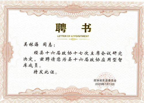 我所主任會計師吳林海同志被政協(xié)如東縣委員會2023年7月13日聘為縣十六屆政協(xié)應(yīng)用型智庫成員。